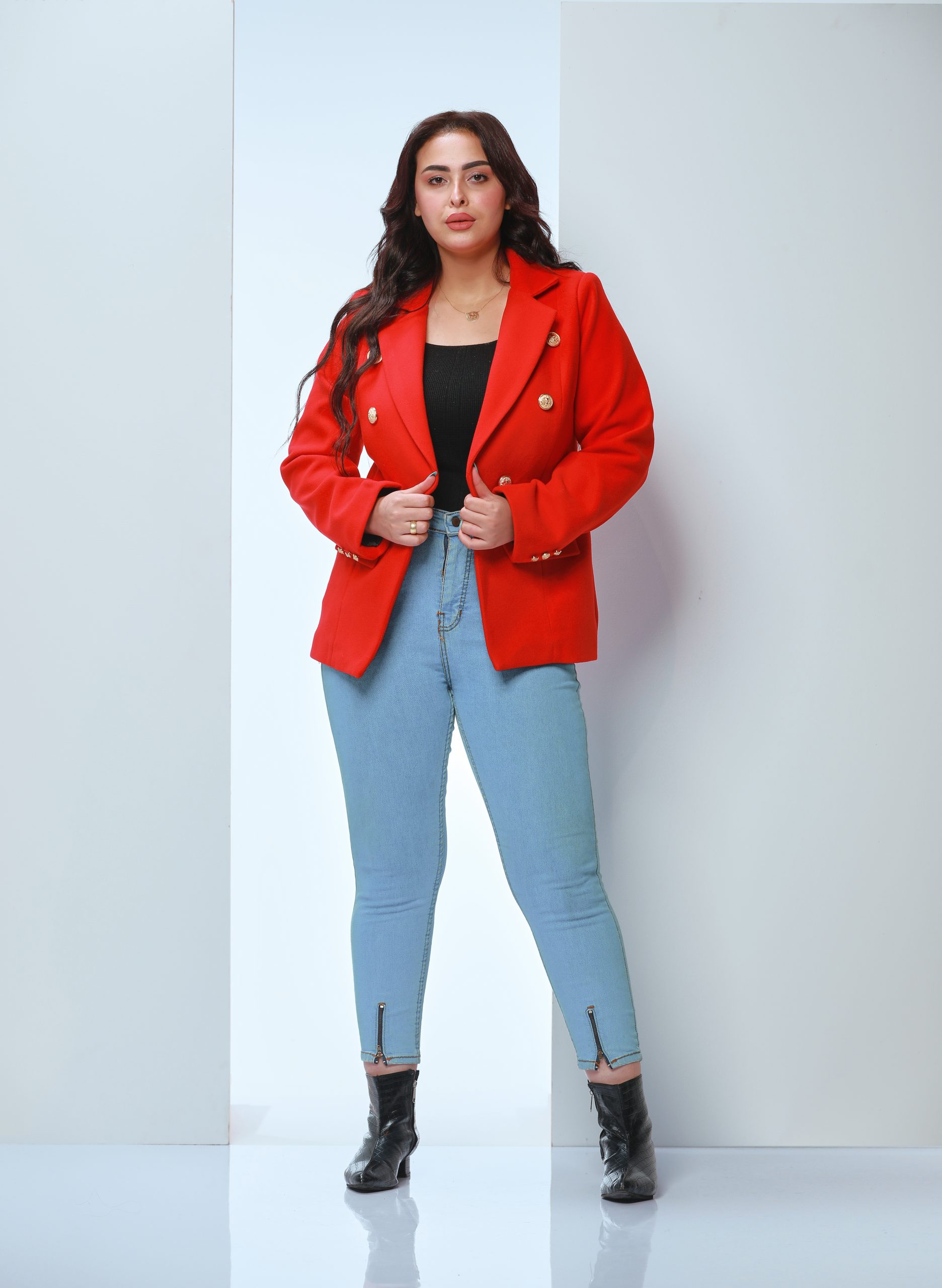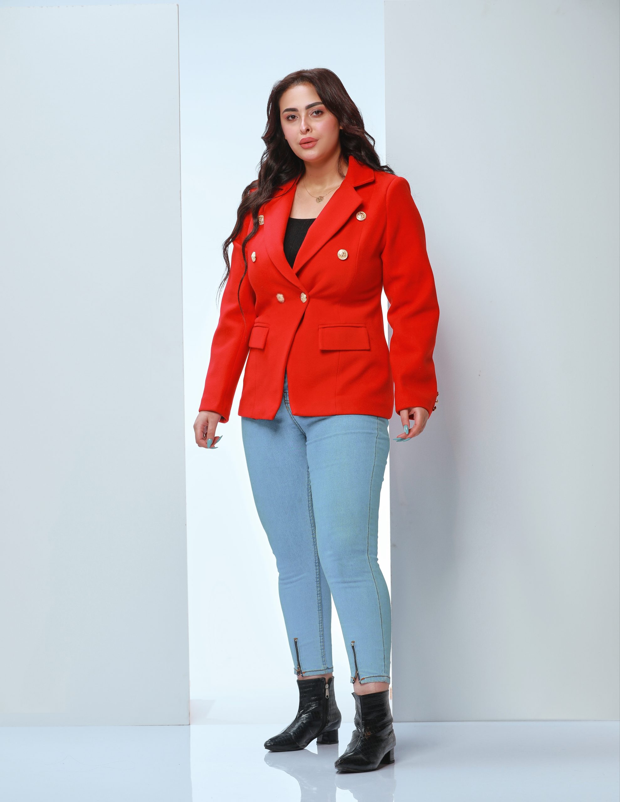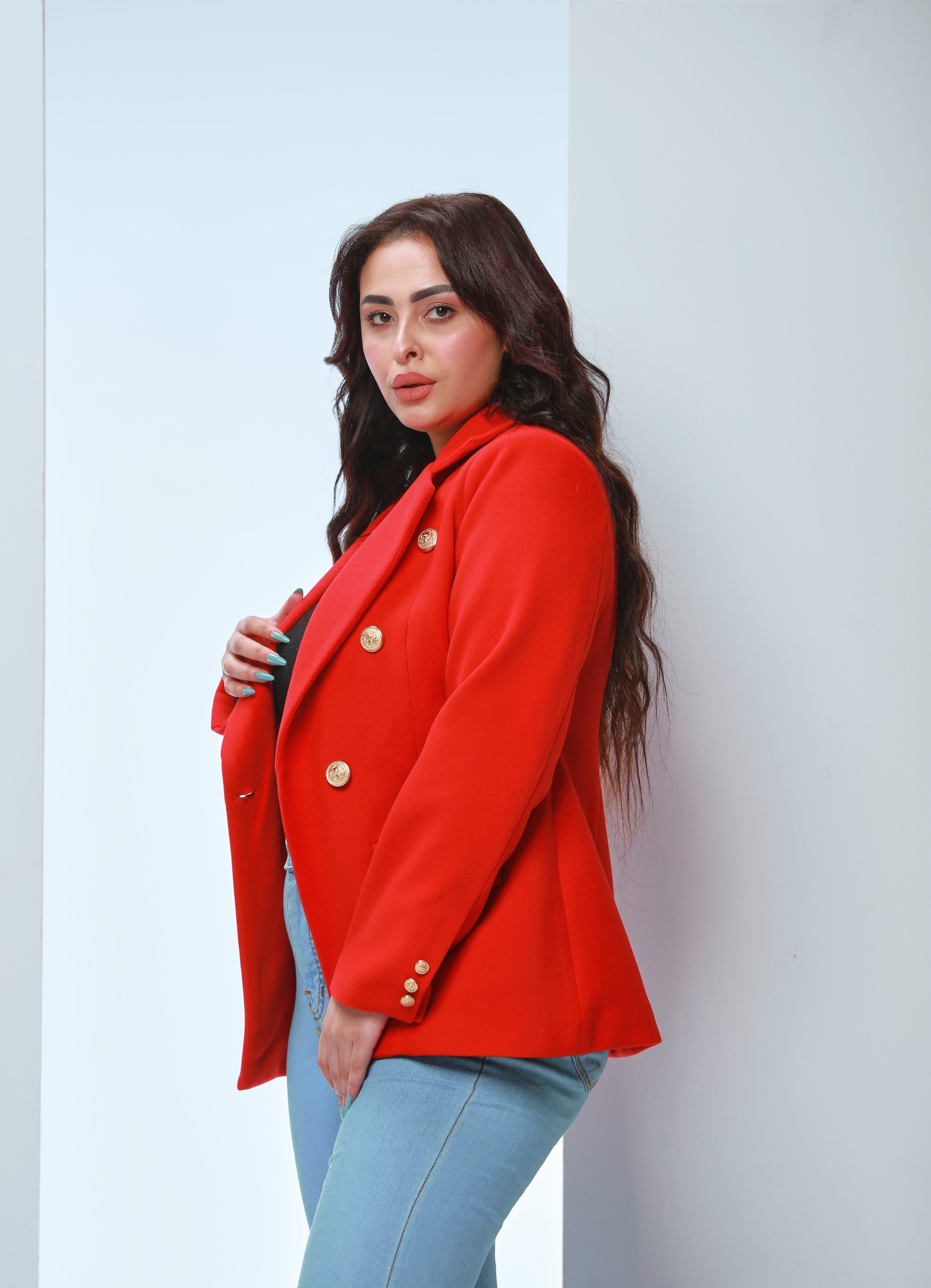 A vibrant red blazer with gold buttons and fine stitching combines timeless European elegance with a flattering straight cut. Perfect for formal or casual looks, it’s a versatile wardrobe essential that blends sophistication with practicality.