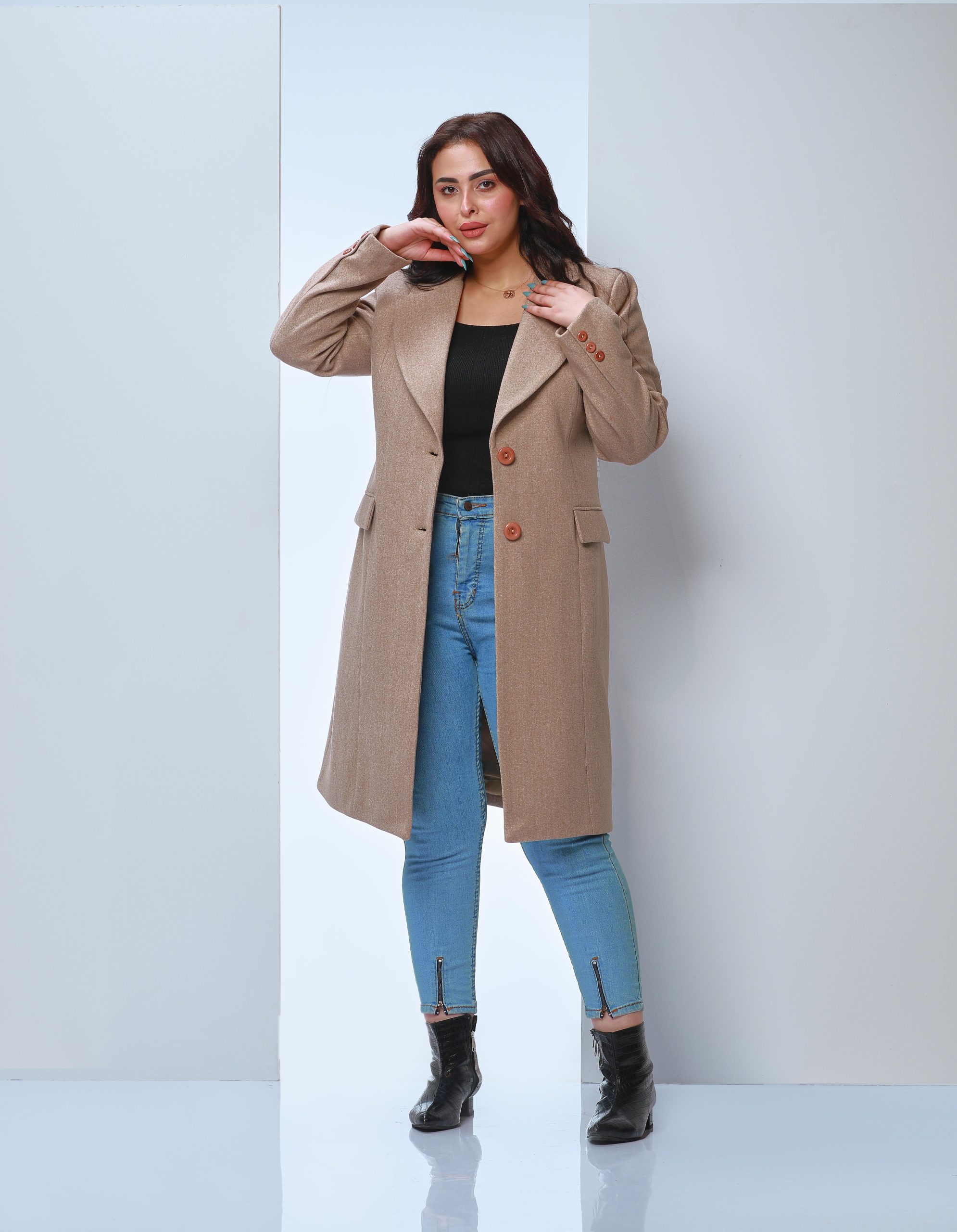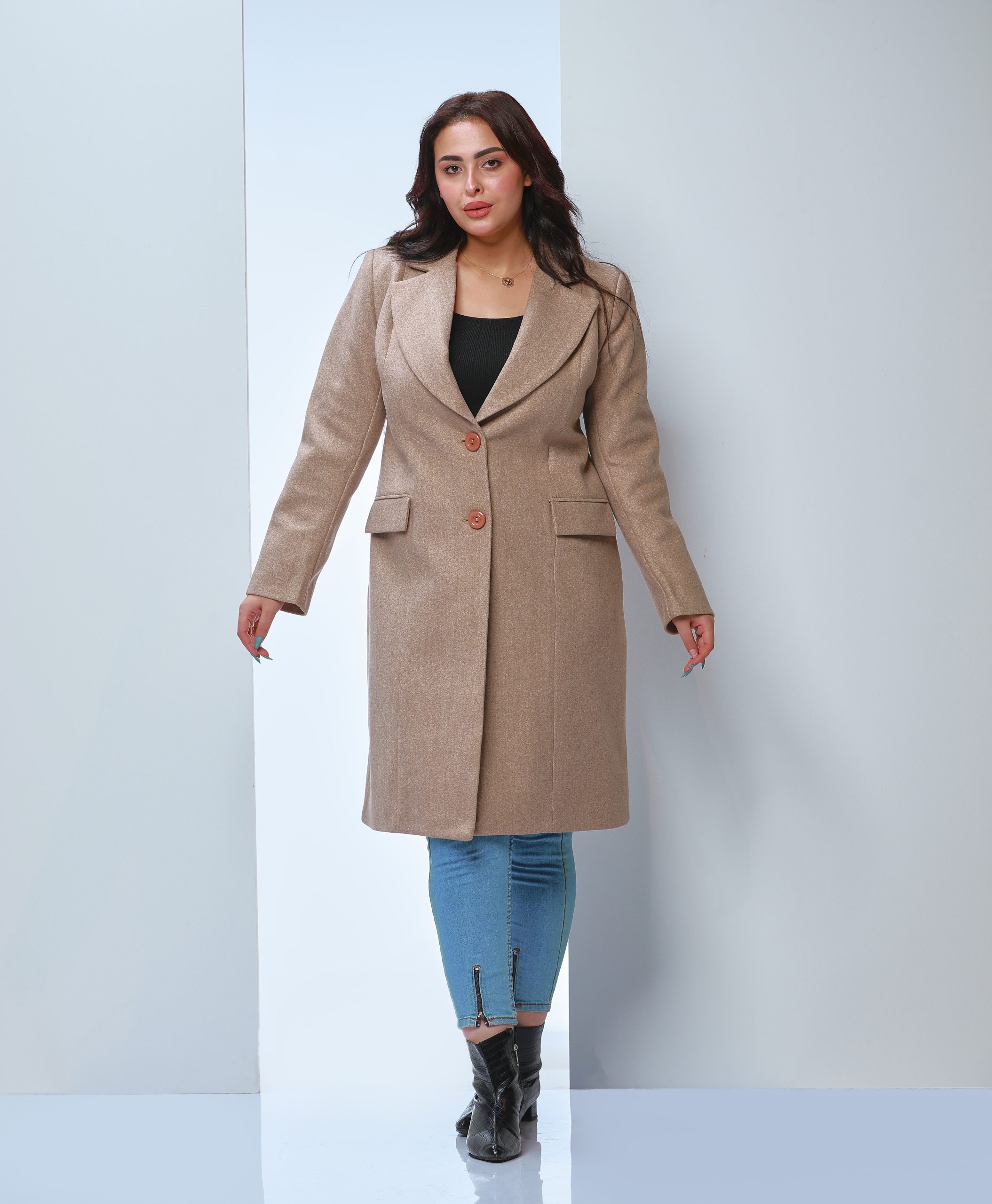 This coat is made of heavy beige felt fabric, featuring a wide lapel and large buttons that add a chic and elegant look. Its simple design and perfect length make it suitable for all occasions, whether casual or formal. It pairs beautifully with jeans or classic trousers, enhancing your style effortlessly