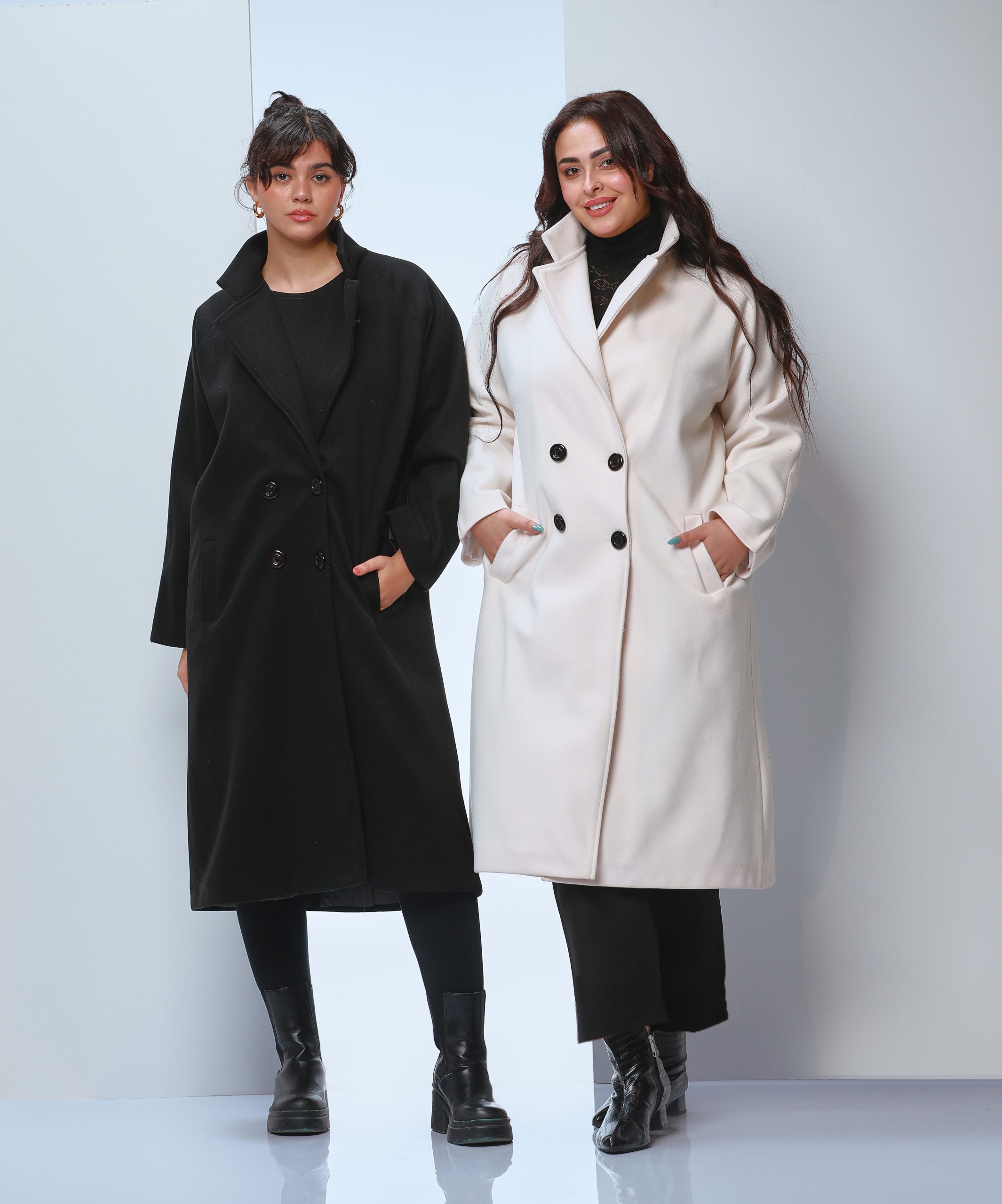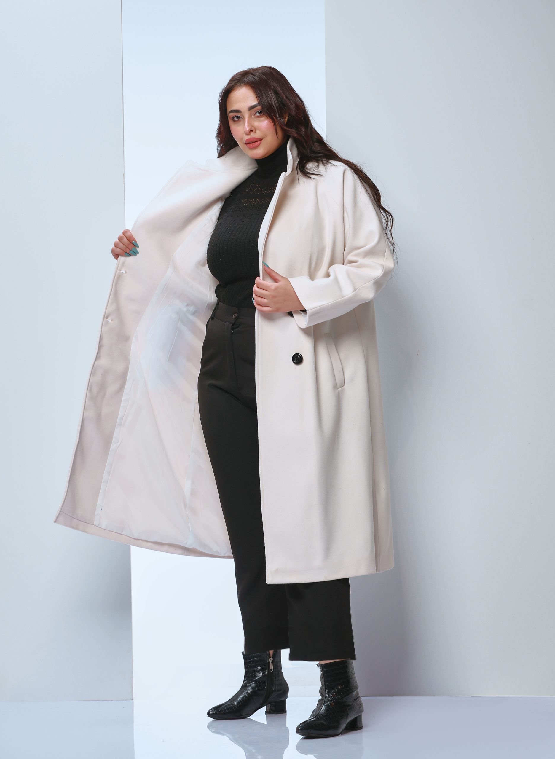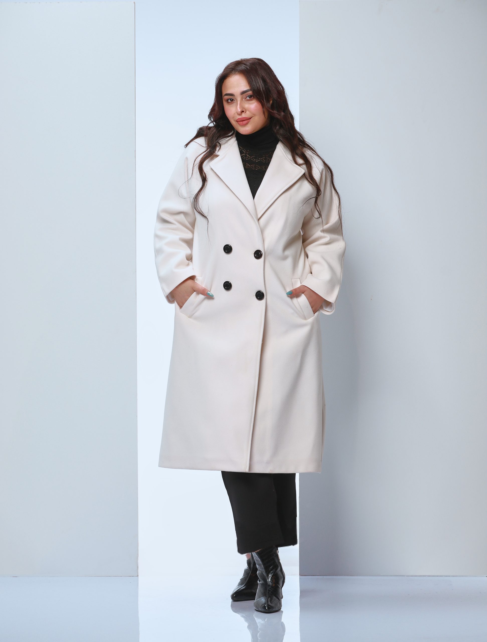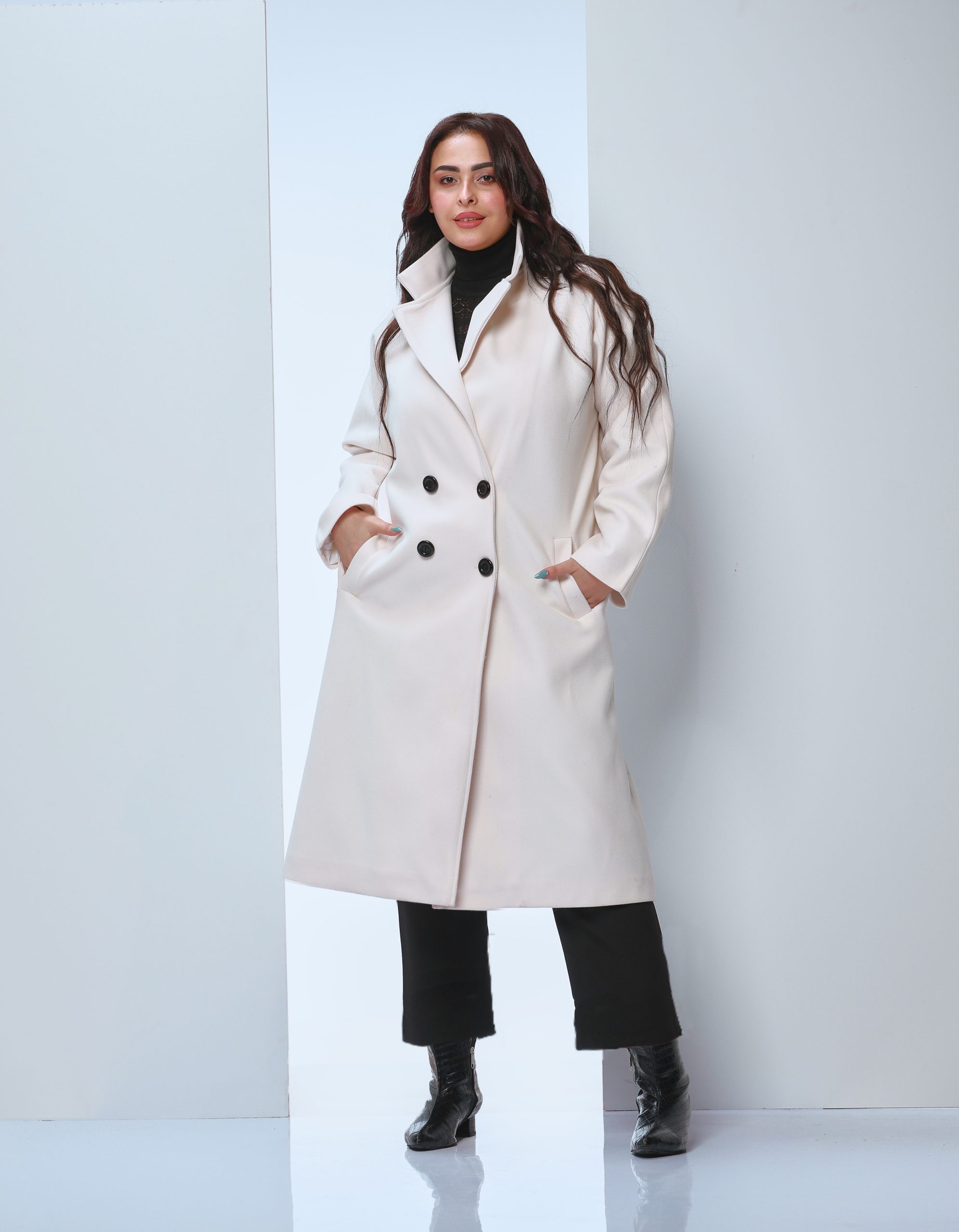an Of-white coat made of wool fabric, lined inside for extra warmth. Features a stylish design with double black buttons and a classic collar that enhances elegance. Suitable for formal occasions and casual outings