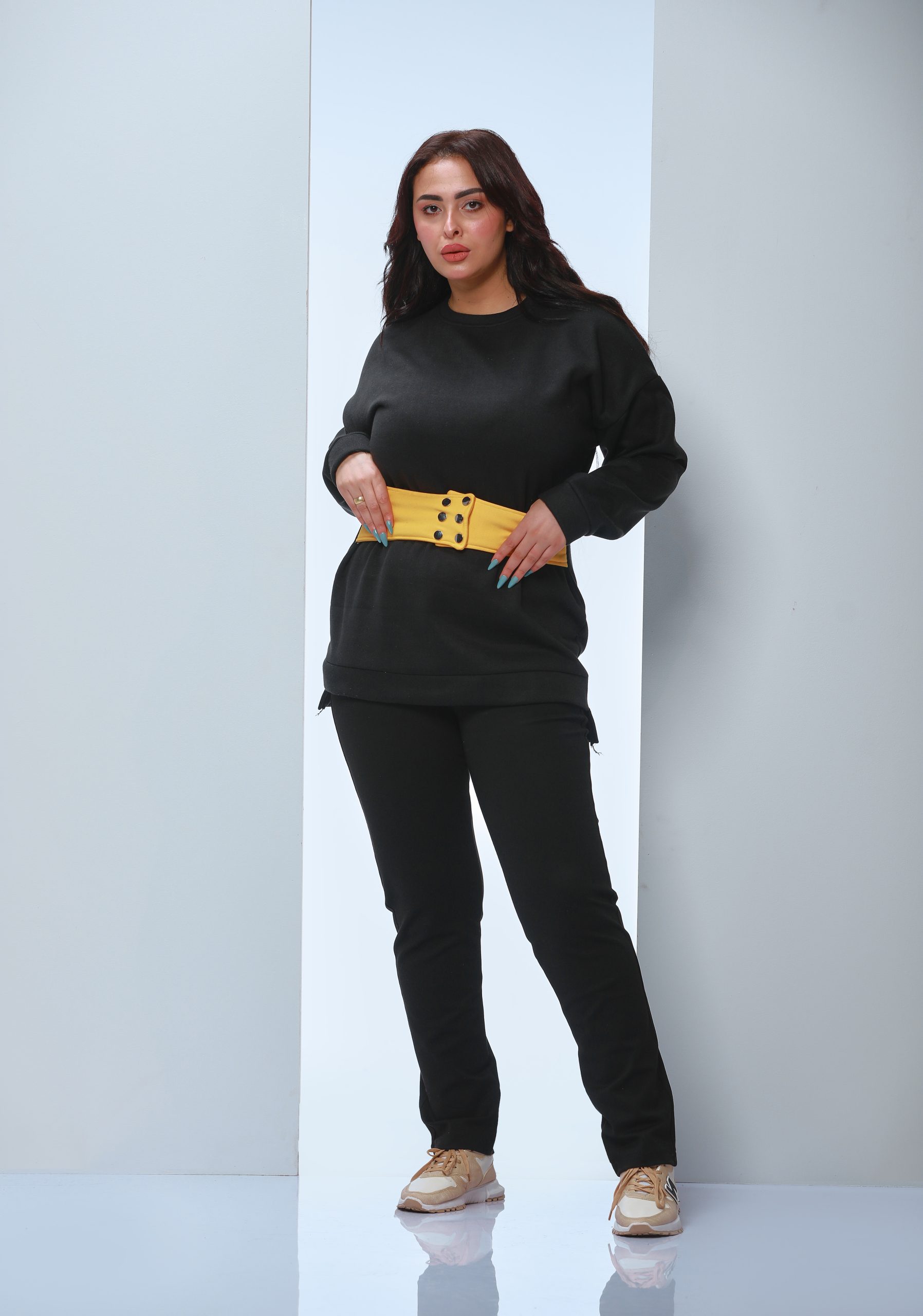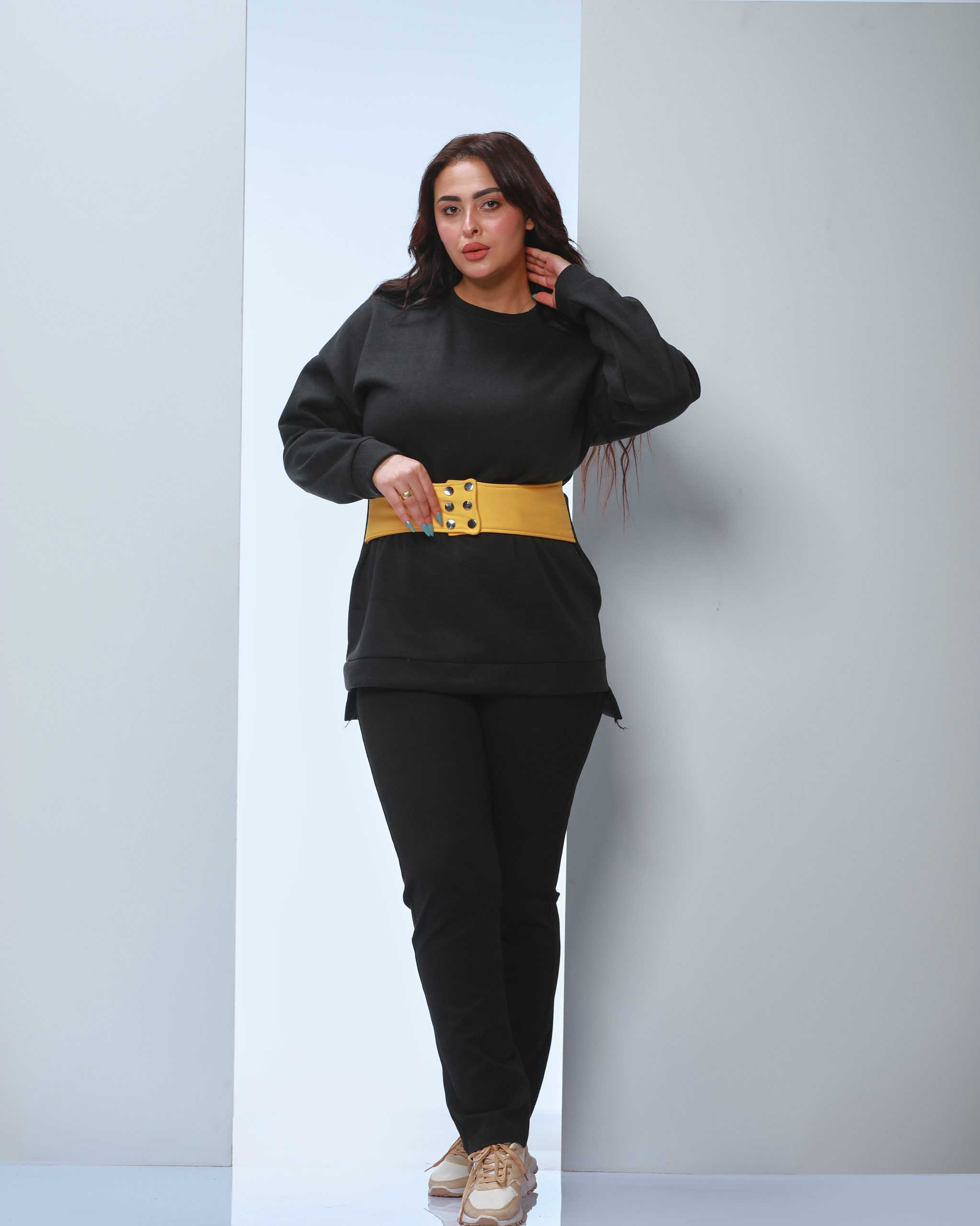 A sweatshirt made from soft melton fabric, featuring a connected waist belt in a contrasting yellow color that highlights the beauty of the design. The strong contrast between the black base and the bold yellow belt adds a modern and daring touch. Its simple design is complemented by a high-low cut, with a longer back and shorter front, combining comfort and elegance seamlessly