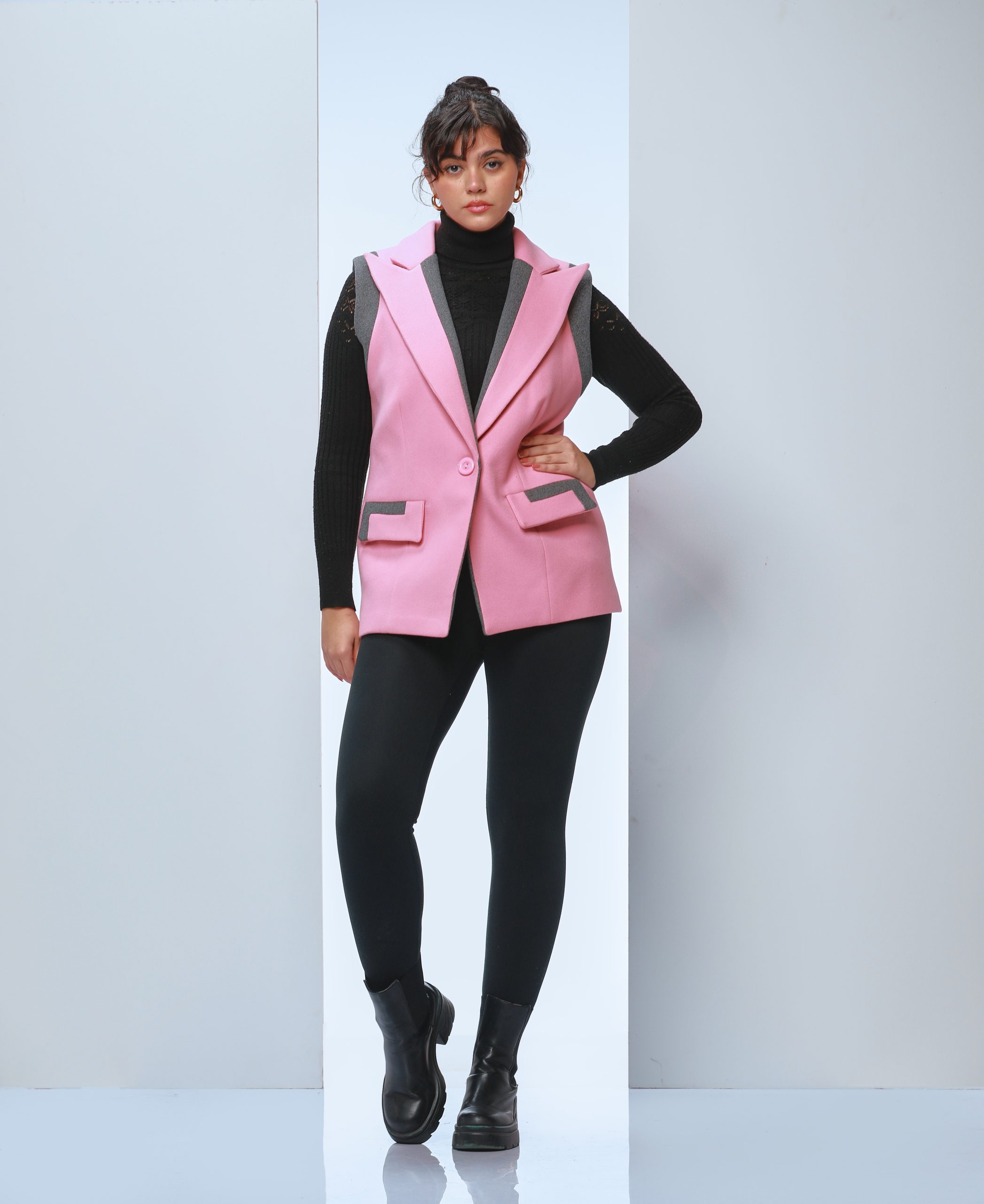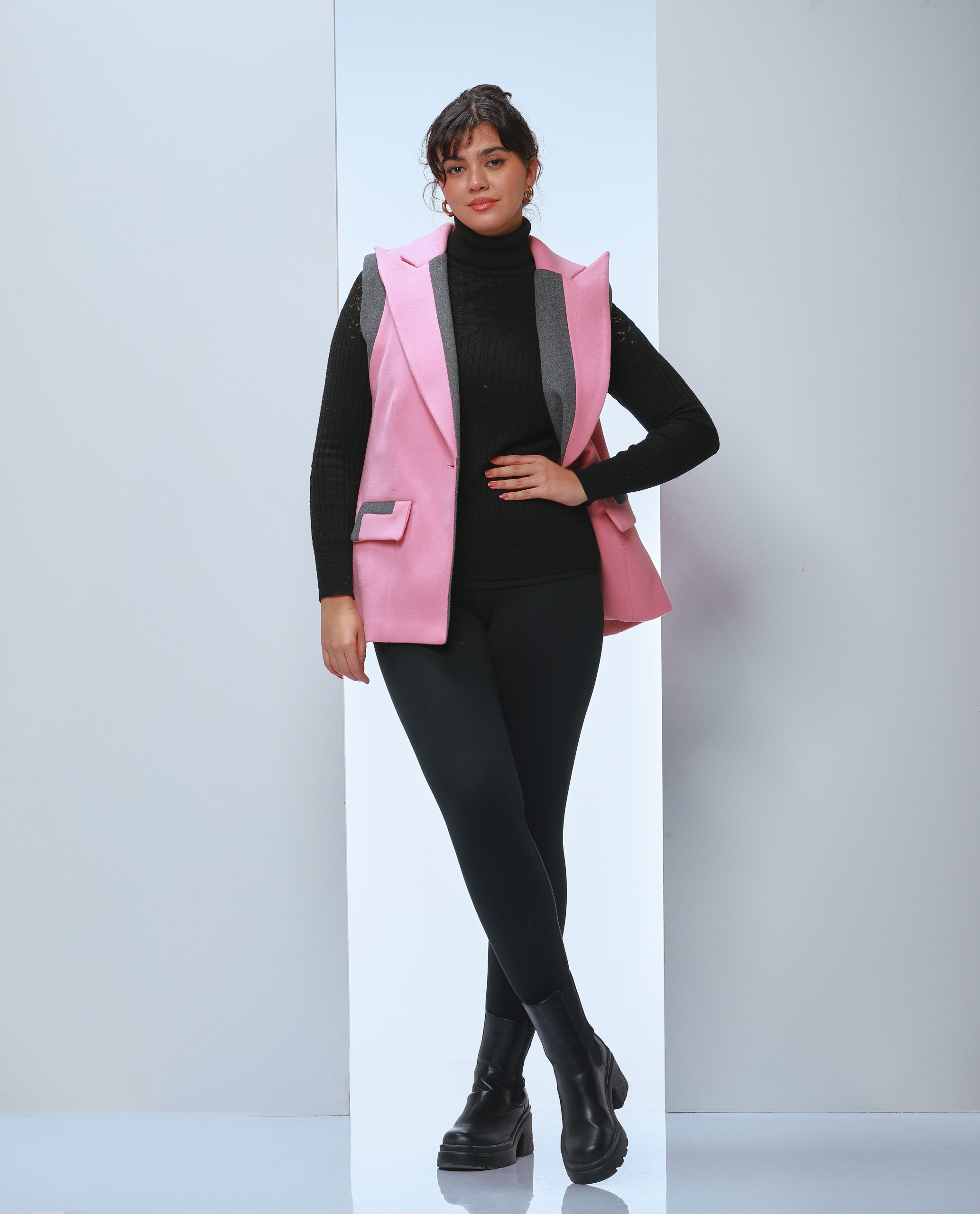A chic vest made of pink felt fabric with gray accents for a standout look. Its modern design makes it a perfect choice for both casual and classic outfits, adding a touch of femininity and elegance to your appearance.